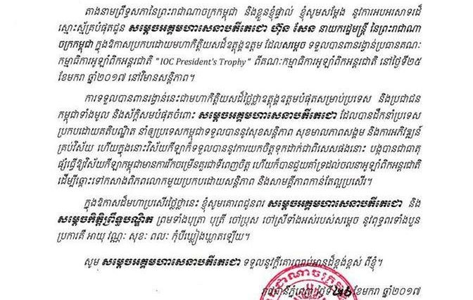 សម្តេចតេជោ ហ៊ុន សែន អញ្ជើញទទួលពានរង្វាន់គណៈកម្មាធិការអូឡាំពិកអន្តរជាតិ IOC President’s Trophy