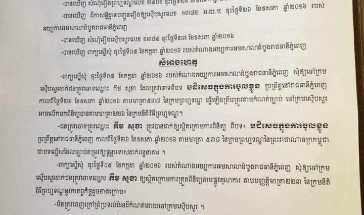 ភ្នំពេញ៖ កម្លាំងសមត្ថកិច្ចរាជធានីភ្នំពេញ នៅព្រឹកថ្ងៃទី១៤ ខែកក្កដា ឆ្នាំ២០១៦នេះ បានយកដីកាថ្មីមួយទៀត ទៅបិទនៅជញ្ជាំងផ្ទះ របស់លោក កឹម សុខា ប្រធានស្តីទីគណបក្សសង្រ្គោះជាតិ ដោយហាមមិនឲ្យលោក កឹម សុខា ធ្វើដំណើរចេញទៅក្រៅប្រទេសនោះឡើយ។ Continue reading “សមត្ថកិច្ចយកដីកាទៅបិទជញ្ជាំងផ្ទះលោក កឹម សុខា ហាមមិនឲ្យចេញទៅក្រៅប្រទេស”