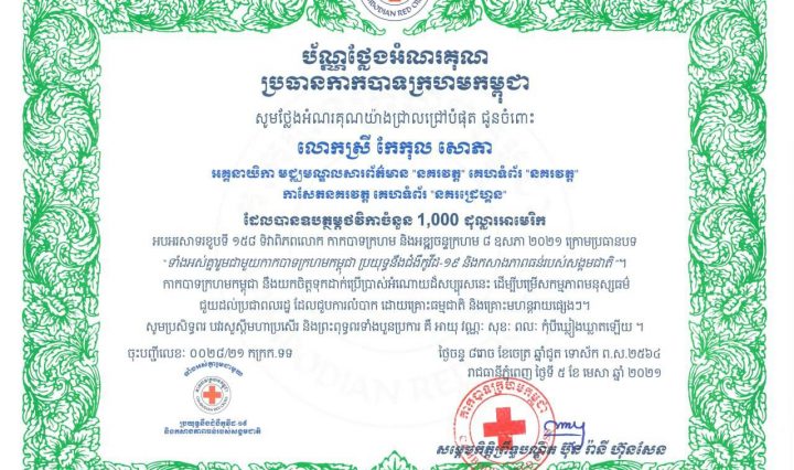 ភ្នំពេញ, នៅរសៀលថ្ងៃទី១១ ខែឧសភា ឆ្នាំ២០២១ សម្ដេចកិតិ្តព្រឹទ្ធបណ្ឌិត ប៊ុនរ៉ានីហ៊ុនសែន ប្រធានកាកបាទក្រហមកម្ពុជា សូមថ្លែងអំណរគុណដ៏ជ្រាលជ្រៅបំផុត ចំពោះលោកស្រីកែកុល សោភា … អានបន្ថែម សម្តេចកិត្តិព្រឹទ្ធបណ្ឌិត ប៊ុនរ៉ានី ហ៊ុនសែន ថ្លែងអំណរគុណយ៉ាងជ្រាលជ្រៅបំផុត ជូនចំពោះ លោកស្រីកែកុល សោភា អគ្គនាយិកា មជ្ឈមណ្ឌលសារព័ត៌មាន “នគរវត្ត”