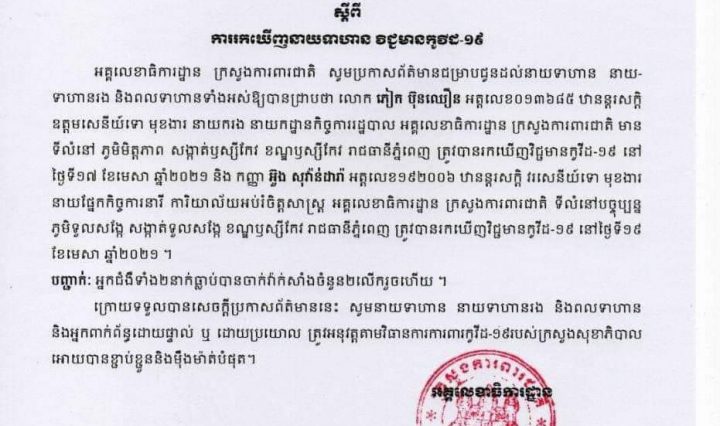 ភ្នំពេញ, សូមមេត្តាជ្រាបជាព័ត៌មាន: សម្រាប់អ្នកទៅចាក់វ៉ាក់សាំងដូសលើកទី២ ក្នុងភូមិសាស្រ្តខណ្ឌសែនសុខ ចាប់ពីថ្ងៃទី២០ ខែមេសា ឆ្នាំ២០២១ តទៅ ។ ការចាក់វ៉ាក់សាំងហាមមិនអោយឆ្លងខណ្ឌ … អានបន្ថែម សម្រាប់អ្នកទៅចាក់វ៉ាក់សាំងដូសលើកទី២ ក្នុងភូមិសាស្រ្តខណ្ឌសែនសុខ ចាប់ពីថ្ងៃទី២០ ខែមេសា ឆ្នាំ២០២១ តទៅ