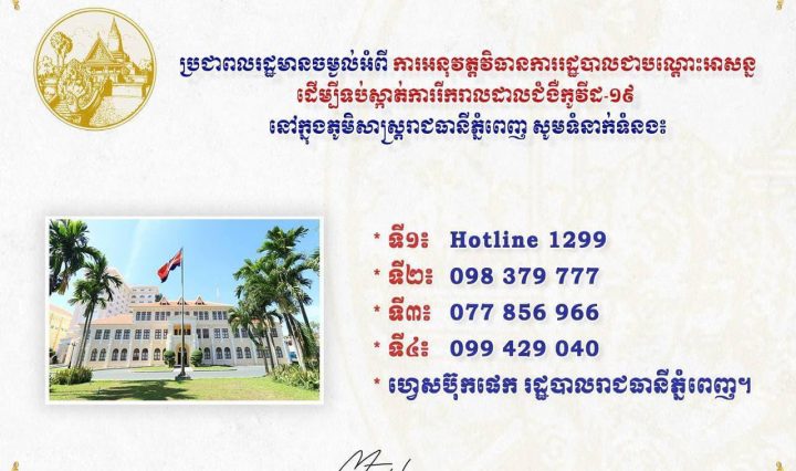 ភ្នំពេញ, សេចក្តីបំភ្លឺរបស់ក្រុមការងារព័ត៌មាន និងប្រតិកម្មរហ័ស នៃស្នងការដ្ឋាននគរបាលរាជធានីភ្នំពេញ បានបញ្ជាក់នៅរសៀលថ្ងៃទី១៥ ខែមេសា ឆ្នាំ២០២១ថា, ក្រុមការងារព័ត៌មាន និងប្រតិកម្មរហ័សនៃស្នងការដ្ឋាននគរបាលរាជធានីភ្នំពេញ មានកិត្តិយសសូមធ្វើការបំភ្លឺជូនប្រជាពលរដ្ឋឲ្យបានជ្រាបថា … អានបន្ថែម លោកស្នងការដ្ឋាននគរបាលរាជធានីភ្នំពេញ បានធ្វើការកោះហៅមន្ត្រី១រូបចូលខ្លួនមកធ្វើកិច្ចសន្យា និងបានធ្វេីការព្រមានអំពីទង្វើខុសឆ្គងនេះអនុញ្ញាតអោយក្រុមគ្រួសារចេញ-ចូលនៅតំបន់បិទខ្ទប់