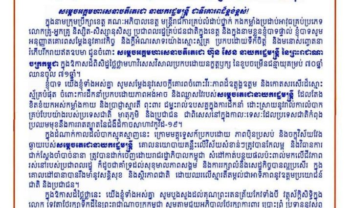 ខេត្តស្ទឹងត្រែង, សារលិខិតគោរពជូនពរ សម្តេចអគ្គមហាសេនាបតីតេជោ ហ៊ុន សែន នាយករដ្ឋមន្រ្តី នៃព្រះរាជាណាចក្រកម្ពុជា🙏 ក្រុមប្រឹក្សាខេត្ត គណៈអភិបាលខេត្ត មន្រ្តីរាជការគ្រប់លំដាប់ថ្នាក់ … អានបន្ថែម សារលិខិតគោរពជូនពរសម្តេចអគ្គមហាសេនាបតីតេជោ ហ៊ុន សែន នាយករដ្ឋមន្រ្តី នៃព្រះរាជាណាចក្រកម្ពុជា🙏