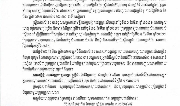 ភ្នំពេញ ៖ បុរសម្នាក់បេីករថយន្តស្ទួចក្នុងល្បឿនលឿន និងមិនប្រយ័ត្នបានជ្រុលទៅបុករថយន្តហុីយ៉ាន់ដាយពីចំហៀងពេញទំហឹងបណ្ដាលឲ្យគៀបជាប់គ្នារងការខូចខាតយ៉ាងដំណំ និងធ្វេីឲ្យបុរស២នាក់រងរបួសបែកមុខមាត់ត្រូវបានបញ្ជូនទៅកាន់មន្ទីរពេទ្យភ្លាមៗ កាលពីវេលាម៉ោង៧ និង៣០នាទីយប់ ថ្ងៃទី២៧ ខែមីនា ឆ្នាំ២០២១ … អានបន្ថែម រថយន្តស្ទួចពន្លះរថយន្តហុីយ៉ាន់ដាយពីចំហៀងពេញទំហឹង បណ្ដាលឲ្យខូចខាតយ៉ាងដំណំ និងរបួស២នាក់