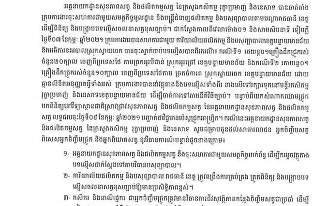 អគ្គនាយកដ្ឋានសុខភាពសត្វ និងផលិតកម្មសត្វ ចេញសេចក្តីប្រកាសព័ត៌មាន