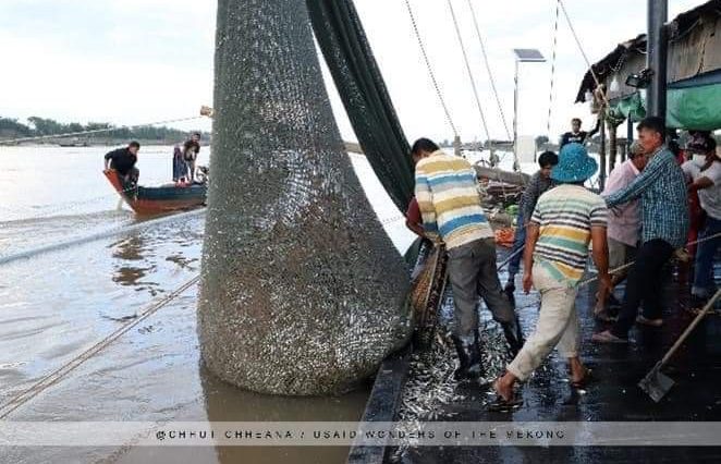 «ត្រីបណ្តូលអំពៅលឿង» ប្រមូលផ្តុំគ្នាចូលទៅក្នុងថង់ប្លាស្ទិក កែវប្លាស្ទិក ដែលអណ្តែតក្នុងទឹកទន្លេសាបដែលក្រុមការងារគម្រោង អច្ឆរិយភាពនៃទន្លេមេគង្គ ប្រមូលបានពីឧករណ៍នេសាទត្រីឧស្សាហកម្ម «ដាយត្រី»