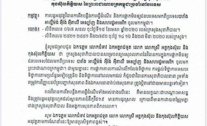 ជនបរទេសមកពីប្រទេសបារាំង,អាល្លឺម៉ង់,អ៉ីរ៉ង់,អ៉ីតាលី អេស្ប៉ាញ,និងអាមេរិក ត្រូវបានកម្ពុជាសម្រេចបន្តផ្អាកមិនឱ្យចូល រហូតដល់ស្ថានភាពកូវីដ១៩ ធូរស្បើយឡើងវិញ