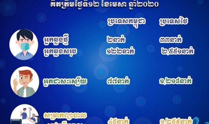 ស្ថានទូតកម្ពុជាប្រចាំប្រទេសថៃបានធ្វើបច្ចុប្បន្នភាពជំងឺកូវីដ១៩ក្នុងប្រទេសកម្ពុជានិងថៃ គិតត្រឹមថ្ងៃទី១២