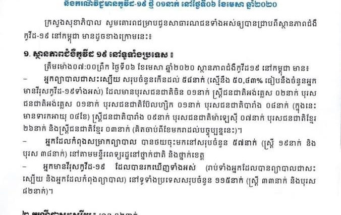 ភ្នំពេញ៖ រហូតម៉ោង ៨ព្រឹក ថ្ងៃទី ៧ មេសា ២០២០ យេីងរកឃេីញអ្នកជំងឺ COVID-19 ១ករណីថ្មី … អានបន្ថែម Update ៖ គិតត្រឹមម៉ោង៨ព្រឹកនេះ រកឃេីញអ្នកជំងឺ COVID-19 ១ករណីថ្មី ជាសះស្បេីយចំនួន ៥ករណីទៀត សរុប ៥៨នាក់ អ្នកស្លាប់គឺគ្មាន
