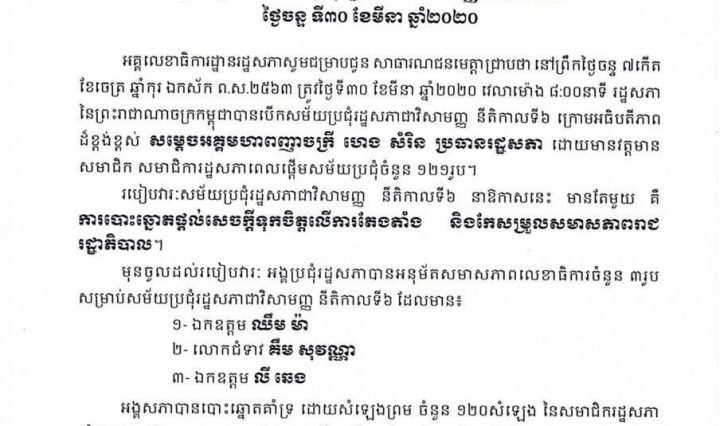 ភ្នំពេញ៖សមាសភាពដូចមានរាយនាមខាងក្រោម៖ ១/តែងតាំងទេសរដ្ឋមន្ត្រី ១-ឯកឧត្តមកិត្តិសេដ្ឋាបណ្ឌិត ចម ប្រសិទ្ធ ជាទេសរដ្ឋមន្ត្រី ២-ឯកឧត្តម ហុឹម ឆែម ជាទេសរដ្ឋមន្ត្រី(ទទួលបន្ទុកបេសកកម្មពិសេស( … អានបន្ថែម សមាសភាពសមាជិករាជរដ្ឋាភិបាលថ្មីដែលរដ្ឋសភាបានធ្វើការបោះឆ្នោតផ្តល់សេចក្តីទុកចិត្តតែងតាំង និងកែសម្រួល