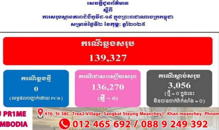 ភ្នំពេញ៖ បើយោងតាមសេចក្ដីជូនដំណឹងរបស់ក្រសួងសុខាភិបាលកម្ពុជា នៅថ្ងៃទី០៣ ខែកុម្ភៈ ឆ្នាំ២០២៥នេះ បានបញ្ជាក់ពីការរកឃើញករណីវិជ្ជមានវីរុសកូវីដ-១៩ថ្មី គ្មានអ្នកឆ្លងថ្មី , គ្មានអ្នកជាសះស្បើយ ខណៈអ្នកជំងឺស្លាប់គ្មាន។ … អានបន្ថែម ថ្ងៃនេះ! ករណីឆ្លងកូវីដ-១៩៖ គ្មានអ្នកឆ្លងថ្មី , គ្មានអ្នកជាសះស្បើយ និងគ្មានអ្នកជំងឺស្លាប់