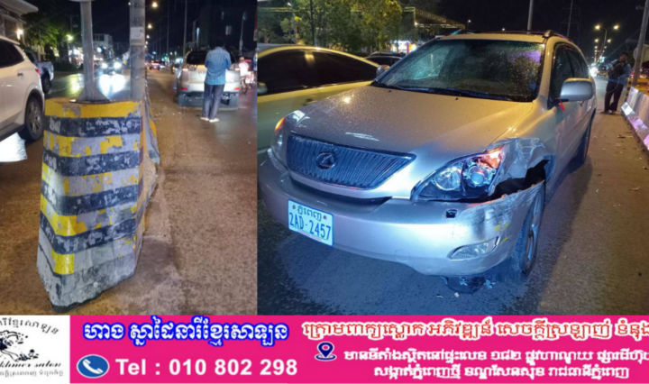 បុរសម្នាក់បើករថយន្តLexus rx 330 មួយគ្រឿងបុករបាំងថ្មពុះចែកទ្រូងផ្លូវ បណ្ដាលឲ្យរងការខូចខាតស្របពេលមេឃកំពុងតែភ្លៀង