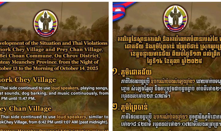 ខេត្តត្បូងឃ្មុំ ៖ អង្គភាពទីបញ្ជាការដ្ឋានកងរាជអាវុធហត្ថខេត្តត្បូងឃ្មុំ និងមូលដ្ឋានកងរាជអាវុធហត្ថស្រុកពញាក្រែក បានឱ្យដឹងថា ៖ នៅវេលាម៉ោង០៧:១៥នាទី ព្រឹកថ្ងៃទី១៤ ខែតុលា ឆ្នាំ២០២៥ … អានបន្ថែម ព្រឹកមុិញ ! មានករណីភ្លើងឆេះការ៉ាស់សាំង មួយកើតឡើង នៅចំណុចភូមិជីមាន់ជើង ឃុំក្រែក ស្រុកពញាក្រែក