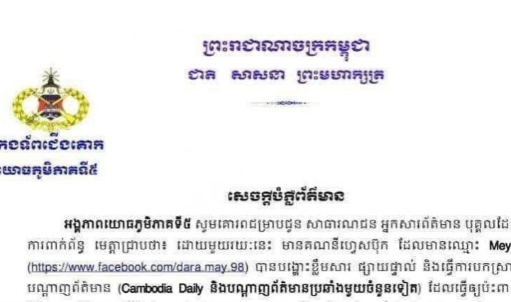 ភ្នំពេញ​៖​ អង្គភាពយោធភូមិភាគទី៥ សូមគោរពជម្រាបជូន សាធារណជន អ្នកសារព័ត៌មាន បុគ្គលដែលមាន ការពាក់ព័ន្ធ មេត្តាជ្រាបថា៖ ដោយមួយរយៈនេះ មានគណនីហ្វេសប៊ុក … អាន​បន្ថែម សេចក្តីបំភ្លឺព័ត៌មានរបស់អង្គភាពយោធភូមិភាគទី៥ កងទ័ពជើងគោកនៃកងយោធពលខេមរភូមិន្ទ​ បុគ្គលឈ្មោះ មី ដារ៉ា ពិតជាធ្លាប់ធ្វើជាយោធិន នៅអង្គភាពយោធភូមិភាគទី៥