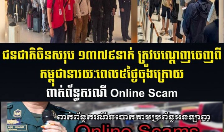 ភ្នំពេញ៖ ក្នុងរយៈពេល ៥ ថ្ងៃជាប់ៗគ្នា កម្លាំងសមត្ថកិច្ចជំនាញរបស់កម្ពុជា បានបញ្ជូនជនជាតិចិនសរុប ១៣៧៩ នាក់ ដែលសង្ស័យពាក់ព័ន្ធនឹងបទល្មើស Online … អានបន្ថែម រយៈពេល ៥ថ្ងៃ! សមត្ថកិច្ចកម្ពុជា បានបណ្ដេញជនជាតិចិន១៣៧៩នាក់ ចេញពីកម្ពុជា ពាក់ព័ន្ធនឹងបទល្មើស Online Scam