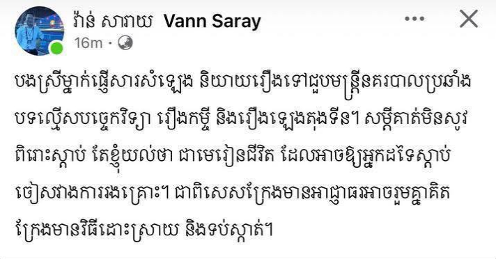 ភ្នំពេញ៖ យោងតាមសេចក្តីជូនដំណឹងរបស់នាយកដ្ឋានប្រឆាំងបទល្មើសបច្ចេកវិទ្យា នៃក្រសួងមហាផ្ទៃ បានឱ្យដឹងនៅថ្ងៃទី១៩ ខែកុម្ភៈ ឆ្នាំ២០២៦នេះថា ក្រោយពីឃើញការបង្ហោះផ្សាយលើទំព័រហ្វេសប៊ុកឈ្មោះ វ៉ាន់ សារ៉ាយ Vann … អានបន្ថែម ករណីជនរងគ្រោះម្នាក់កម្ចីអនឡាញ ដែលបានមកដាក់ពាក្យបណ្ដឹង នៅនាយកដ្ឋានប្រឆាំងបទល្មើសបច្ចេកវិទ្យា ប៉ុន្ដែបែរជាត្រូវមន្រ្ដីដែលទទួលពាក្យបណ្ដឹងស្ដីបន្ទោសឱ្យគាត់