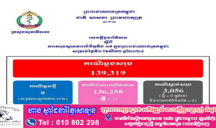 ថ្ងៃនេះ! ករណីឆ្លងកូវីដ-១៩៖ គ្មានអ្នកឆ្លងថ្មី , មានអ្នកជាសះស្បើយ ០១នាក់ និងគ្មានអ្នកជំងឺស្លាប់