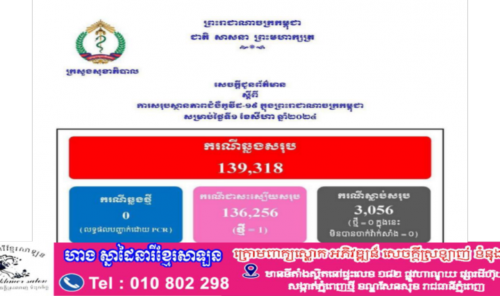 ថ្ងៃនេះ! ករណីឆ្លងកូវីដ-១៩៖ គ្មានអ្នកឆ្លងថ្មី , មានអ្នកជាសះស្បើយ ០១នាក់ និងគ្មានអ្នកជំងឺស្លាប់
