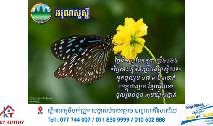 ភ្នំពេញ៖ ក្រសួងបរិស្ថាន នៅព្រឹកថ្ងៃទី២៥ ខែកក្កដា ឆ្នាំ២០២៤នេះ បានឱ្យដឹងថា សាធារណជនបន្តរួមគ្នាកសាងវប្បធម៌ស្អាតជារៀងរាល់ថ្ងៃ ក្នុងយុទ្ធនាការកាត់បន្ថយការប្រើប្រាស់ប្លាស្ទិក និងយុទ្ធនាការ “កម្ពុជាស្អាត … អានបន្ថែម ក្រសួងបរិស្ថាន៖ សាធារណជនបន្តរួមគ្នាកសាងវប្បធម៌ស្អាតជារៀងរាល់ថ្ងៃ ក្នុងយុទ្ធនាការកាត់បន្ថយការប្រើប្រាស់ប្លាស្ទិក និងយុទ្ធនាការ “កម្ពុជាស្អាត ខ្មែរធ្វើបាន”