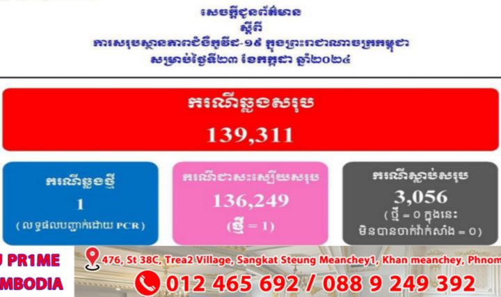 ថ្ងៃនេះ! ករណីឆ្លងកូវីដ-១៩៖ មានអ្នកឆ្លងថ្មី ០១នាក់, មានអ្នកជាសះស្បើយ ០១នាក់ និងគ្មានអ្នកជំងឺស្លាប់