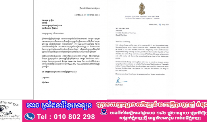 ភ្នំពេញ ៖ សម្តេចអគ្គមហាសេនាបតីតេជោ ហ៊ុន សែន ប្រធានព្រឹទ្ធសភានៃព្រះរាជាណាចក្រកម្ពុជា ផ្ញើសារលិខិតរំលែកទុក្ខ ជូន ឯកឧត្តម To … អានបន្ថែម សម្តេចតេជោ ហ៊ុន សែន ផ្ញើសារលិខិតរំលែកទុក្ខ ជូន ឯកឧត្តម To Lam ប្រធានរដ្ឋសាធារណរដ្ឋសង្គមនិយមវៀតណាម ចំពោះមរណភាពរបស់ ឯកឧត្តម Nguyen Phu Trong អគ្គលេខាធិការគណៈកម្មាធិការមជ្ឈឹមបក្សកុម្មុយនីស្តវៀតណាម