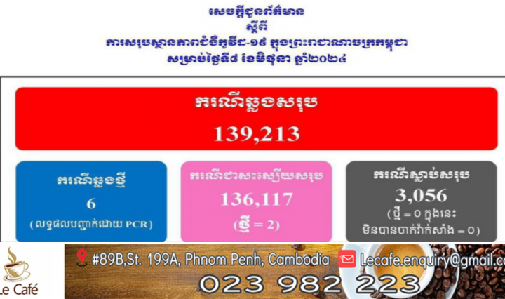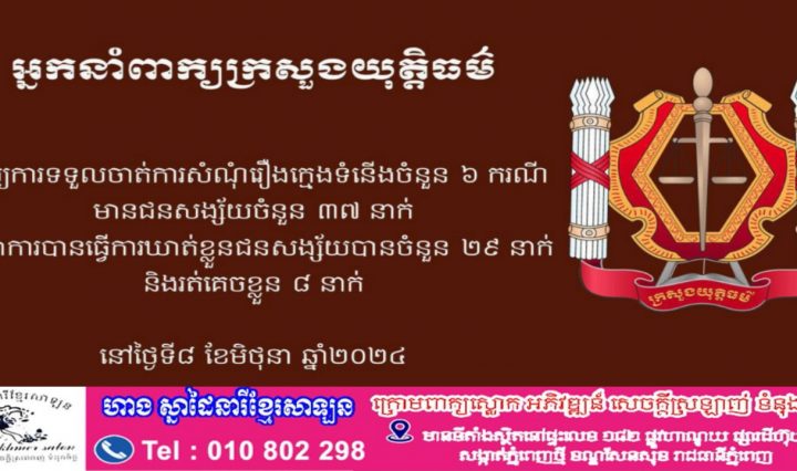 ភ្នំពេញ ៖ នៅរសៀលថ្ងៃទី៩ ខែមិថុនា ឆ្នាំ២០២៤ មន្ទីរប្រឆាំងគ្រឿងញៀន បានបញ្ជាក់ថា ៖ បង្ក្រាបករណីរក្សាទុក ដឹកជញ្ជូន … អានបន្ថែម បង្ក្រាបករណីរក្សាទុក ដឹកជញ្ជូន និងជួញដូរគ្រឿងញៀន ឃាត់ខ្លួនជនល្មើសជនជាតិវៀតណាម ៨នាក់ ជាមួយគ្រឿងញៀនជាង១០គីឡូក្រាម និងសារធាតុគីមីផ្សំជាង ៣០គីឡូក្រាម