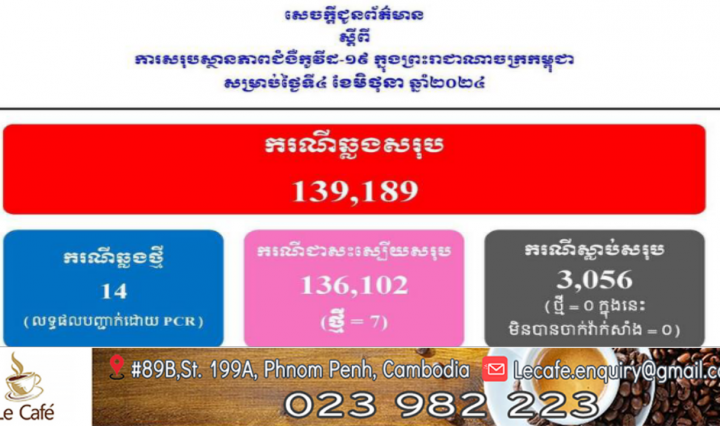 សូមប្រុងប្រយ័ត្នថ្ងៃនេះ! ករណីឆ្លងកូវីដ-១៩៖ មានអ្នកឆ្លងថ្មី ១៤នាក់, មានអ្នកជាសះស្បើយ ០៧នាក់ និងគ្មានអ្នកជំងឺស្លាប់