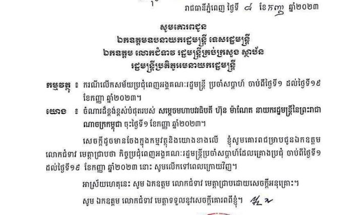 គណៈរដ្ឋមន្ត្រីប្រកាសលើកពេលសម័យប្រជុំពេញអង្គគណៈរដ្ឋមន្ត្រីប្រចាំសប្តាហ៍ ចាប់ពីថ្ងៃទី១ ដល់ថ្ងៃទី១៩ ខែកញ្ញា ឆ្នាំ២០២៣