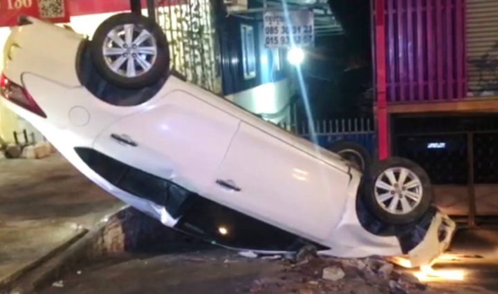 ស្រវឹងស្រាបេីករថយន្តរេចង្កូតទៅបុករបាំងថ្មនិងរបងផ្ទះប្រជាពលរដ្ឋក្រឡាប់ផ្ងារជើងទ្រមេឃ