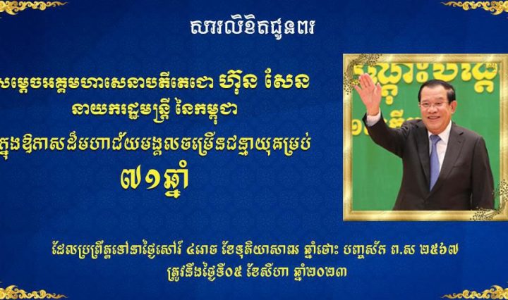 ភ្នំពេញ ៖ ឯកឧត្តម ឃួង ស្រេង អភិបាលរាជធានីភ្នំពេញ និងលោកជំទាវ ព្រមទាំងមន្ត្រីរាជការក្រោមឱវាទទាំងអស់, ឯកឧត្ដម ម៉ប់ … អានបន្ថែម ឯកឧត្តម ឃួង ស្រេង និងឯកឧត្ដម ម៉ប់ សារិន ផ្ញើសារលិខិតគោរពជូនពរ សម្ដេចតេជោ ហ៊ុន សែន ក្នុងឱកាសចម្រើនជន្មាយុគម្រប់ ៧១ឆ្នាំ