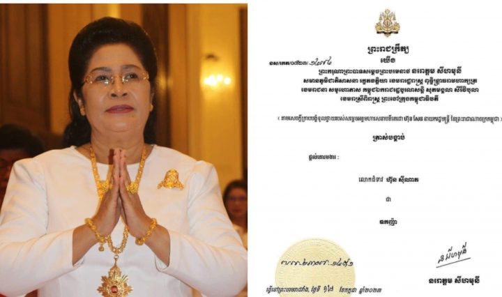 លោកស្រី ហ៊ុន សុីណាត ត្រូវបានព្រះមហាក្សត្រនៃព្រះរាជាណាចក្រកម្ពុជា ប្រោសព្រះរាជទានផ្តល់គោរមងារជនលោកស្រីជាឧកញ៉ា