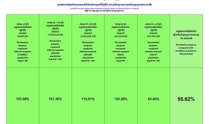 ក្រសួងសុខាភិបាល : លទ្ធផលចាក់វ៉ាក់សាំងធៀបនឹងចំនួនប្រជាជនសរុប ១៦លាន នាក់ មាន ៩៥,៦២%
