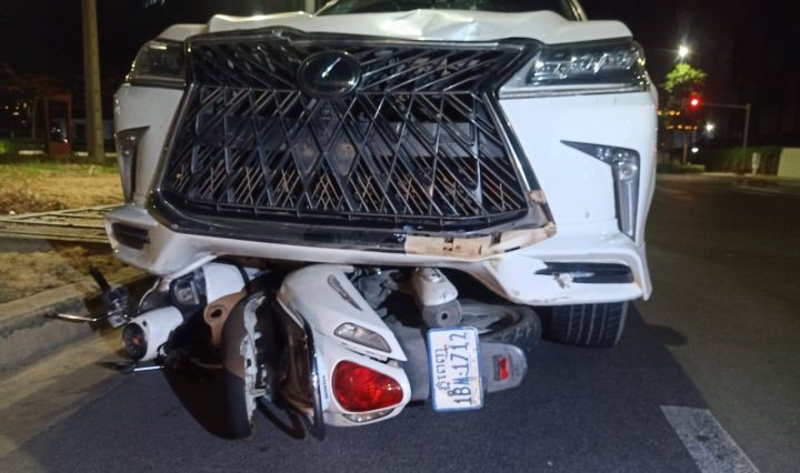 រថយន្ត Lexus LX- 570 បុកជាមួយម៉ូតូនៅត្រង់ចំណុចភ្លើងស្តុបផ្លូវបំបែកជាបួន អូសជិត២០ម៉ែត្រ បណ្ដាលឱ្យយុវជនពីរនាក់រងរបួសធ្ងន់