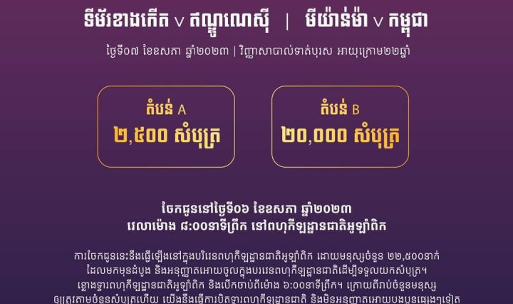 ភ្នំពេញ : នៅល្ងាចថ្ងៃទី៥ ខែឧសភា ឆ្នាំ២០២៣ នេះ សម្ដេចអគ្គមហាសេនាបតីតេជោ ហ៊ុន សែន នាយករដ្ឋមន្ត្រី … អានបន្ថែម ល្ងាចនេះ សម្ដេចតេជោ ហ៊ុន សែន នឹងអញ្ជើញបើកព្រឹត្តិការណ៍ស៊ីហ្គេមលើកទី៣២ និងអាស៊ានប៉ាររ៉ាហ្គេមលើកទី១២