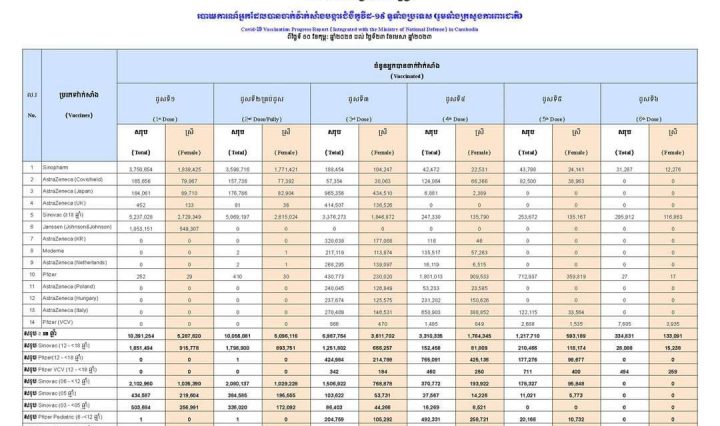ភ្នំពេញ : ក្រសួងសុខាភិបាល នៅយប់ថ្ងៃទី២៣ ខែមេសា ឆ្នាំ២០២៣ បានបញ្ជាក់អោយដឹងថា, កំណេីនអត្រាចាក់វ៉ាក់សាំងកូវីដ-១៩ នៅកម្ពុជា គិតត្រឹមថ្ងៃទី២៣ … អានបន្ថែម ក្រសួងសុខាភិបាល : លទ្ធផលចាក់វ៉ាក់សាំងធៀបនឹងចំនួនប្រជាជនសរុប ១៦លាន នាក់ មាន ៩៥,៥២%