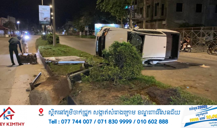 រថយន្ត ford ranger បើកមិនប្រយ័ត្នរេចង្កូតឡើងលើសួនពុះចែកផ្លូវទៅបុកបង្គោលស្លាកប៉ាណូបណ្ដាលឲ្យរថយន្ដក្រឡាប់ផ្ងារជើង