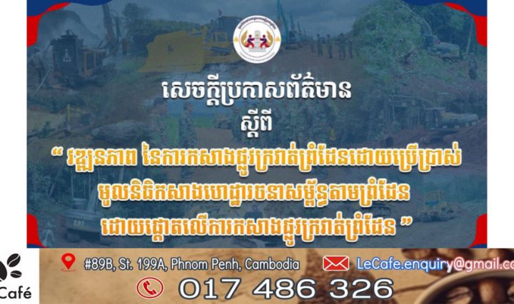 ព្រំដែន៖ ដោយអនុវត្តយ៉ាងខ្ជាប់ខ្ជួន និងប្រកបដោយស្មារតីទទួលខុសត្រូវខ្ពស់ តាមអនុសាសន៍ណែនាំដ៏ខ្ពង់ខ្ពស់បំផុតរបស់ សម្តេចមហាបវរធិបតី ហ៊ុន ម៉ាណែត នាយករដ្ឋមន្ត្រី នៃព្រះរាជាណាចក្រកម្ពុជា ស្តីពី … អានបន្ថែម សេចក្តីប្រកាសព័ត៌មានស្តីពី វឌ្ឍនភាព នៃការកសាងផ្លូវក្រវាត់ព្រំដែន ដោយប្រើប្រាស់ មូលនិធិកសាងហេដ្ឋារចនាសម្ព័ន្ធតាមព្រំដែន ដោយផ្តោតលើការកសាងផ្លូវក្រវាត់ព្រំដែន