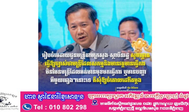 សម្តេចធិបតី ៖ “រៀបចំមេដាយជូនមន្រ្ដីតាមក្រសួង-ស្ថាប័នរដ្ឋ សូមផ្ដោតធ្វើឱ្យច្បាស់ថាមន្ត្រីដែលសកម្ម និងមានវត្ដមានធ្វើការ មិនមែនមន្ត្រីដែលអត់មានមុខមកធ្វើការ ឬមានបញ្ហាអីមួយផ្សេងៗនោះទេ គឺសុំឱ្យចំគោលដៅតែម្ដង”
